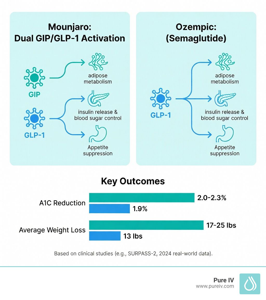 Both drugs are weekly injectable medications called incretin mimetics —they mimic natural gut hormones that regulate blood sugar and appetite. The key difference is that Mounjaro activates two hormones (GLP-1 and GIP) while Ozempic activates one (GLP-1 only).