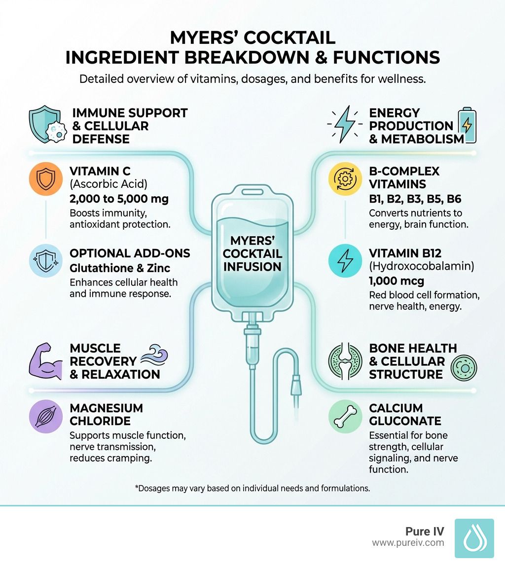 What vitamins are in a myers cocktail is a question we hear frequently from people seeking faster recovery from fatigue, dehydration, or illness. The Myers' Cocktail is an intravenous vitamin therapy that typically contains: